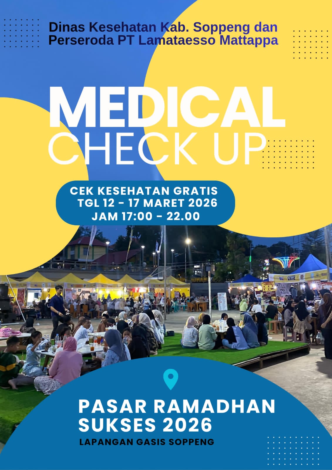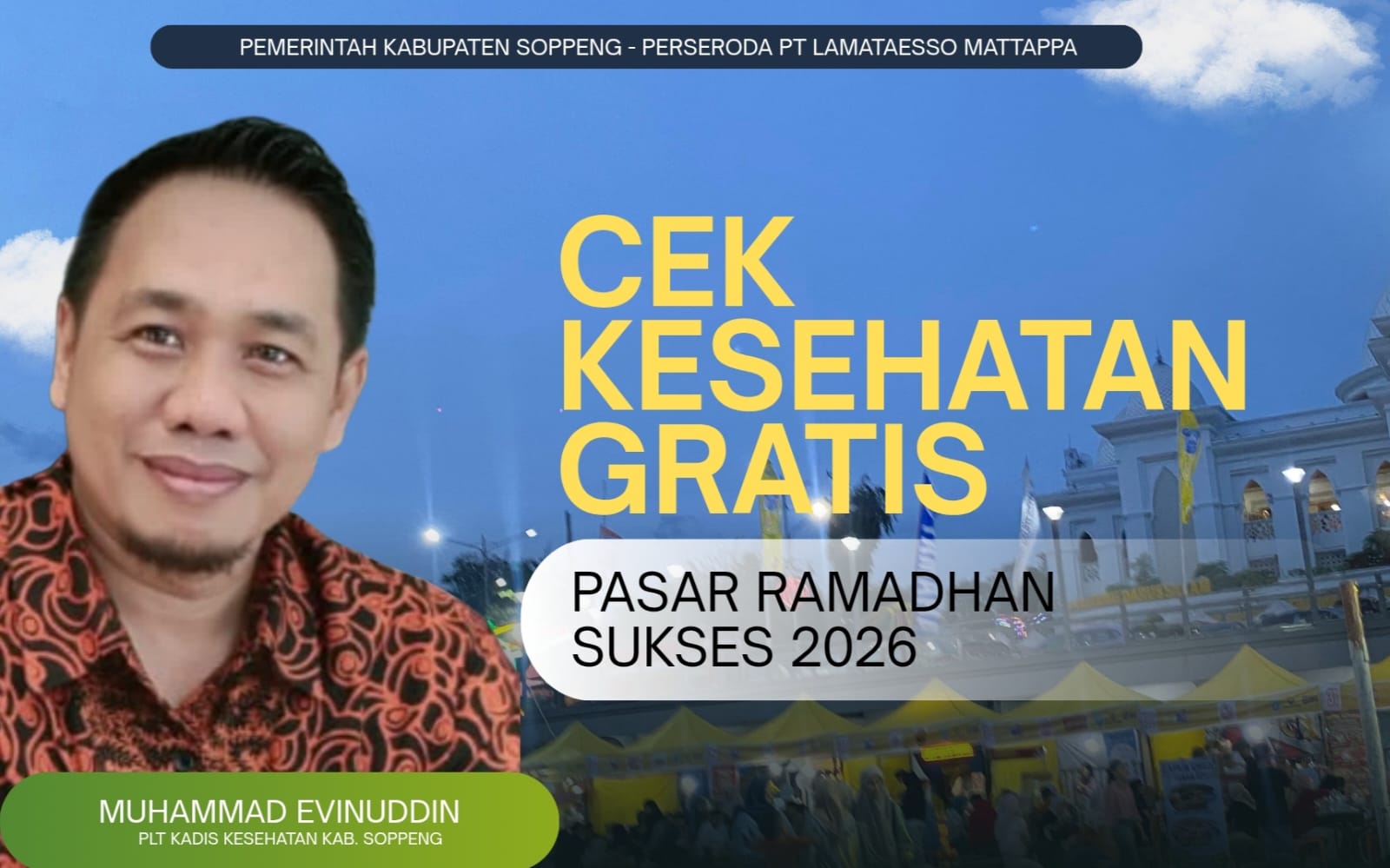 WATANSOPPENG — Pemerintah Kabupaten Soppeng bekerja sama dengan Perseroda PT Lamataesso Mattappa menghadirkan layanan Cek Kesehatan Gratis (CKG) bagi masyarakat di area Pasar Ramadhan SUKSES 2026 yang berlangsung di Lapangan Gasis Watansoppeng. Layanan kesehatan ini dibuka setiap hari mulai pukul 17.00 hingga 22.00 WITA.